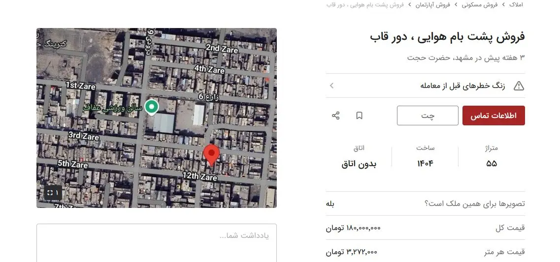 در مشهد، فروشندهای دیگر در منطقه حضرت حجت، پشتبام دو طبقه روی یک خانه را با قیمت پایه ۱۸۰ میلیون تومان آگهی کرده است. در توضیحات آمده: «پشتبام هوایی، هر طبقه جدا. دور قاب در صورت نیاز جداگانه محاسبه میشود!» این یعنی حتی نرده و چارچوب هم بخشی از معامله نیست، باید جدا بخرید!