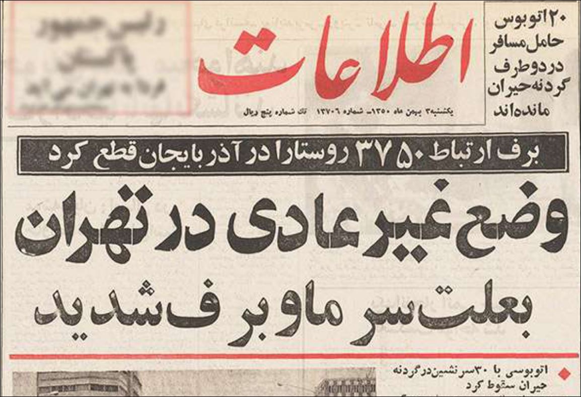 در نشریات دیگر بهمن 1350 میخوانیم: «۲۰ هزار نفر از ساکنان ۱۵۰ روستای کشور در محاصره برف قرار گرفتهاند»، «در محلات حمزهآباد و پیرانشهر ۴۰ خانوار زیر بهمن مدفون شدند»، «۱۸۰ نفر در ارتفاعات گیلان ناپدید شدند»، «دهکدهای در نزدیک رضائیه بر اثر سقوط بهمن ویران شد و جسد ۱۸ تن از قربانیان از زیر برف بیرون کشیده شد».