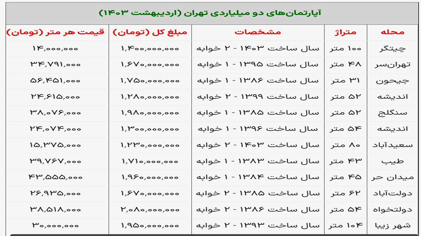 به گزارش اخبار ساخته ها؛ اگر قصد خرید خانه دارید و حداکثر بودجه شما ۲ میلیارد تومان در ادامه به بررسی قیمت آپارتمانهایی که سقف قیمت آنها دو میلیارد است میپردازیم.