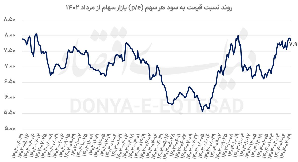 در شرایط فعلی همچنان ارزش دلاری بازار زیر سطح میانگین تاریخی خود در میانه کانال 100میلیارد دلار قرار دارد. نسبت قیمت به سود هر سهم بازار سرمایه در انتهای معاملات روز دوشنبه در سطح 7.9واحد قرارگرفت. متوسط P/E بورس تهران در سطح 8واحد قرار دارد که طی روز گذشته نسبت قیمت به سود هر سهم بازار به سطح میانه خود رسید. بورس تهران از مرداد ماه 1402 از شکستن سطح 8واحد P/E ناکام ماندهاست. حالا پس از گذشت 21ماه نسبت قیمت به سود هر سهم بازار سهام بار دیگر به سطح 8واحد رسیدهاست. شکست این سطح قطعا به یک محرک قوی احتیاج دارد و بدون محرک نمیتوان انتظار داشت بازار سرمایه بتواند از این سطح دیرینه عبور کند.