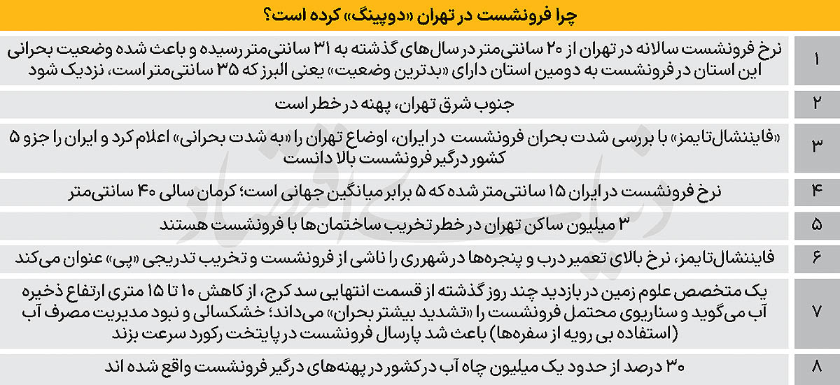 به گزارش اخبارساخته ها؛ شتاب ۱.۵ برابری نرخ فرونشست در تهران، «جایگاه بحرانی» این کلانشهر را به آستانه دومین استان دارای بدترین وضعیت برای سکونت به لحاظ شکنندگی سطح زمین رسانده است؛ این وضعیت باعث شده «فایننشالتایمز» مطالعاتی درباره ابعاد بحران فرونشست در تهران و ایران تهیه کند. گزارش «دنیایاقتصاد» از آنچه این روزنامه بینالمللی درباره «فرونشست» منتشر کرده، حاکی است: نرخ بالای فرونشست زمین در ایران و بهویژه استانهای درگیر این پدیده، کشورمان را جزو ۵ کشور اول جهان به لحاظ «سرعت بالای فرونشست» قرار داده است.