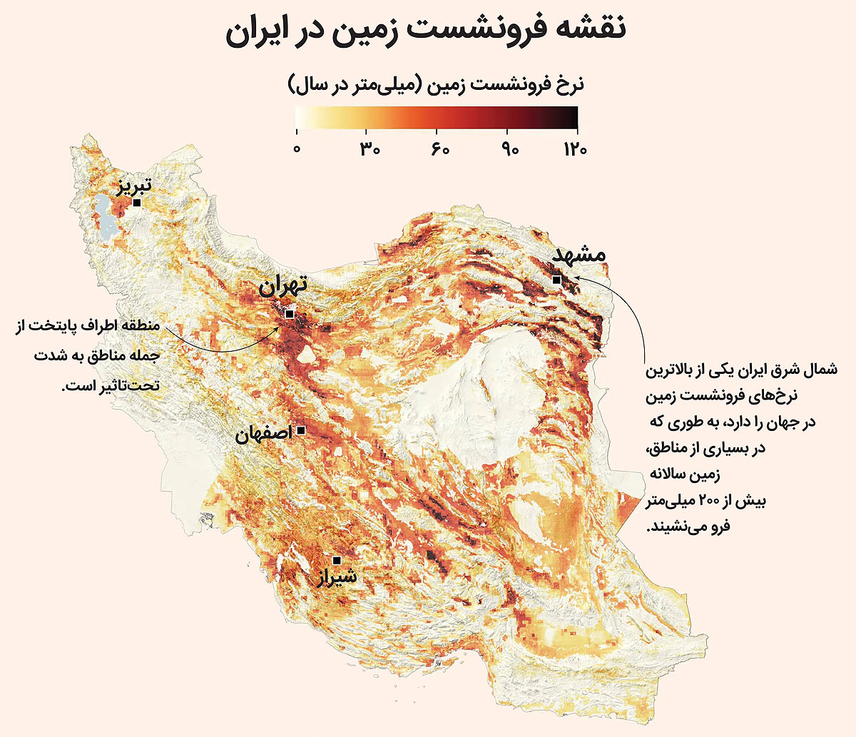 بر اساس گزارشی از فایننشال تایمز، ایران با یکی از بدترین (بیشترین) نرخهای فرونشست زمین در جهان مواجه است؛ پدیدهای که در پی خشکسالی، تغییرات اقلیمی و مدیریت نادرست منابع آب شکل گرفته است. شکافهای ایجادشده در زمین، فرودگاه اصلی کشور و مکانهای ثبتشده در فهرست یونسکو مانند شهر تاریخی تختجمشید را تهدید میکنند، و سال گذشته دهها مدرسه در یک شهر به دلیل نگرانی از فروریختن و تخریب تخلیه شدند.