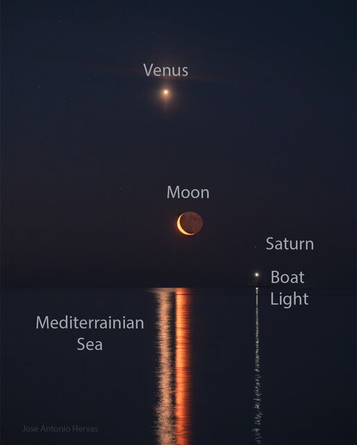 همین اثر اغلب برای خورشید درست پیش از غروب و پس از طلوع آن دیده میشود. این عکس حدود ۱۰ روز پیش در جزیره ایبیزا واقع در اسپانیا گرفته شده است. در این عکس، ماه در حال غروب، سیاره زهره در قسمت بالا و سیاره زحل در سمت راست هم به صورت مستقیم و هم به صورت بازتاب خطی از دریای مدیترانه گرفته شدهاند.