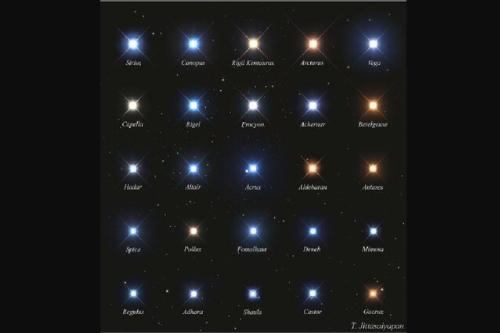 در این عکس ثبتشده با رنگ واقعی، ۲۵ ستاره درخشان آسمان شب که در حال حاضر توسط انسانها دیده میشوند، به همراه نامهای تعیینشده توسط اتحادیه بینالمللی نجوم نمایش داده شدهاند. برخی از نامها معانی جالبی دارند؛ از جمله «سیریوس»(Sirius) به معنای سوزاننده در لاتین، «وگا»(Vega) به معنای در حال فرود آمدن در عربی و «آنتارس»(Antares) به معنای رقیب مریخ در یونانی. احتمالاً شما با نام حداقل یک ستاره که برای قرار گرفتن در این فهرست بسیار کمنور است، آشنا هستید. این ستاره، «پولاریس»(Polaris) یا ستاره قطبی است.
