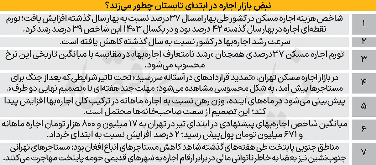 سرعت رشد اجارهبهای مسکن کشور در بهار امسال نسبت به بهار سال قبل اندکی کاهش یافت؛ با این وجود همچنان مستاجران با تورمی بالاتر از میانگین تاریخی و نرخهای متعارف در این بازار مواجه هستند. درحالی که دادههای مرکز آمار ایران از فروکش تورم اجاره در کشور خبر داد، شاخص اجارهبهای دنیای اقتصاد از نبض بازار تهران نیز عقبگرد در سرعت رشد تورم اجارهبها در بهار امسال را تایید میکند. فروکش تورم اجاره در بهار میتوانست خبری خوش برای مستاجران در آستانه فصل تابستان بهعنوان زمان اوجگیری جابهجاییها باشد؛ با این وجود حمله 12روزه رژیم صهیونیستی به کشور بازار اجاره و جابهجاییها را به خصوص در تهران و شهرهای حاشیه آن دستخوش تغییراتی کرد، بررسیهای میدانی از تمدید اضطراری قراردادهای اجاره برای تیر و مرداد حکایت دارد. با وجود این، آینده این بازار میتواند متاثر از عواملی نظیر کاهش سطح تقاضا برای خانه در شهر تهران، نوسان بازارهای موازی و زمان حصول آرامش کامل سیاسی در کشور متفاوت باشد.
