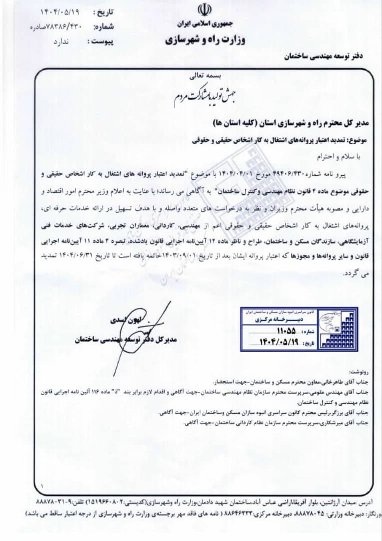 مدیرکل دفتر توسعه مهندسی ساختمان وزارت راه و شهرسازی از تمدید پروانه های مهندسی تا پایان شهریور ۱۴۰۴ خبر داد.