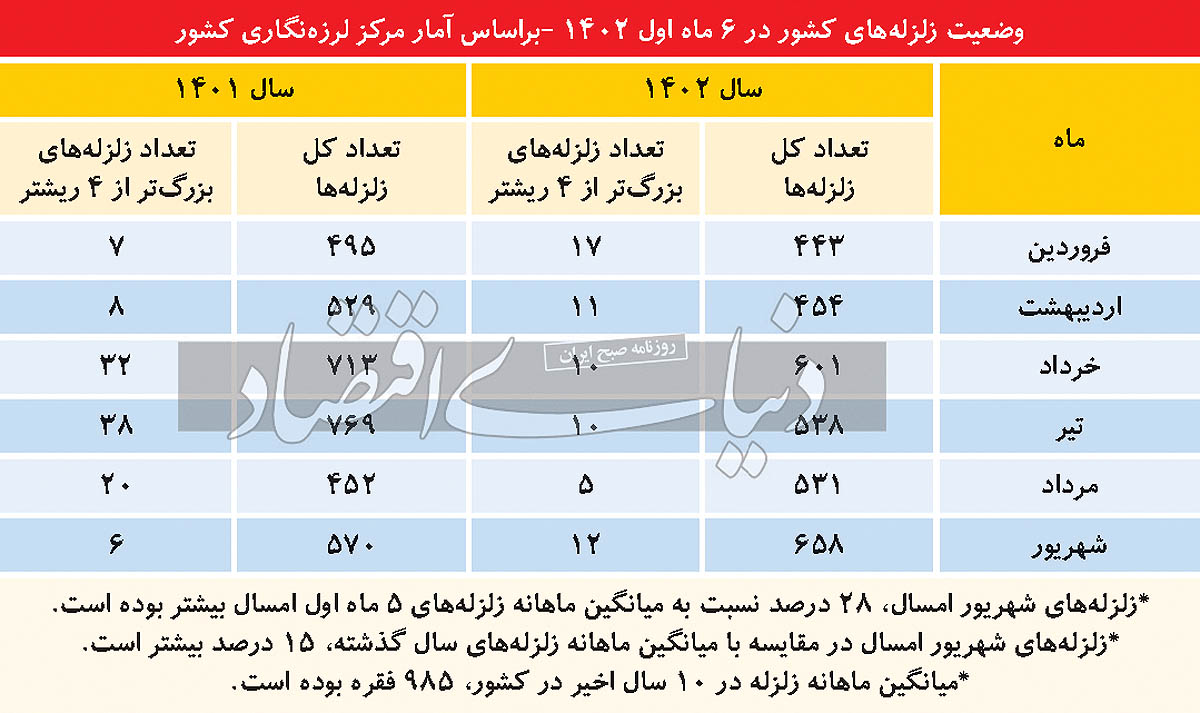 نکته مهم دیگر افزایش دو برابری رخداد زمینلرزههای با بزرگای بیش از 4 ریشتر در شهریور ماه امسال نسبت به شهریور سال گذشته است. شهریور امسال 12 رخداد زمینلرزه با بزرگای بیش از 4 ریشتر در کشور به ثبت رسید که این میزان در شهریور سال قبل، 6 مورد بود.