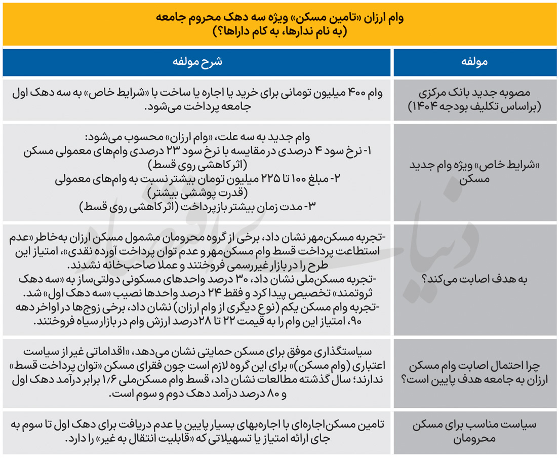 به گزارش اخبارساخته ها؛ بانک مرکزی روز گذشته برای اجرای یکی از تکالیف بودجه 1404 مرتبط با «تسهیلات تکلیفی ویژه تامین مسکن محرومین»، 3 نوع وام ویژه مصوب کرد، اما 3 تجربه طی دو دهه گذشته در «پرداخت تسهیلات ارزان و ارائه امکانات خاص به اسم مسکنحمایتی»، احتمال «اصابت وام ارزان به کمدرآمدها» را پایینتر از حد تصور مسوولان نشان میدهد.