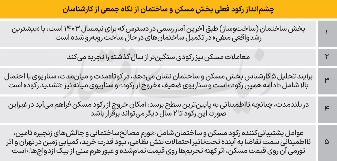 بازار مسکن و صنعت ساختمان کشور با رکود مستمری دستوپنجه نرم میکند؛ درحالیکه مطالعات میدانی این رکود را تایید میکند؛ دادههای رسمی نیز موید رکود در سرمایهگذاری ساختمانی است. براساس آخرین گزارش مرکز آمار حجم سرمایهگذاری برای «تکمیل» ساختمانها در نیمه اول ۱۴۰۳ به لحاظ رشد واقعی، ۳۲درصد کاهش یافت که بیشترین ریزش در مقایسه با ۷سال قبل از آن است. برای بررسی آینده صنعت ساختمان و بازار املاک کشور شیشه عمر رکود را در گفتوگو با 5 کارشناس این حوزه بررسی کردیم. نتایج این بررسیها سه سناریو از بازار مسکن را ترسیم میکند. در کوتاهمدت محتملترین سناریو استمرار رکود، سناریو با احتمال متوسط تشدید رکود و سناریو با احتمال کم نیز کاهش رکود است. اما آینده این بازار در بلندمدت بیش از هر فاکتوری به استمرار یا رفع تنشهای سیاسی بازمیگردد. اگر ریسکهای سیاسی مرتفع شود، رونق در این بخش در بلندمدت محتمل میشود و در صورت عدم رفع تنش سیاسی، باید منتظر استمرار رکود در بلندمدت بود.