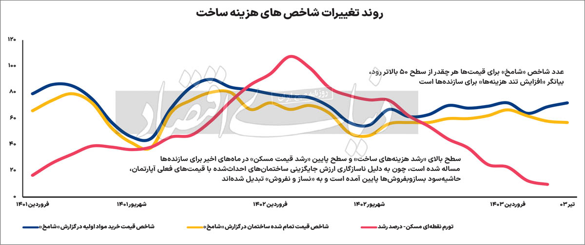 تورم ساخت مسکن سومین عامل عقبگرد سازندگان خانه از این فعالیت تولیدی است. برخی مصالح ساختمانی پرمصرف ظرف یک سال اخیر صعود قیمتی قابلتوجه را تجربه کردند. در بازه سالانه منتهی به ابتدای تابستان امسال قیمت آهن رشدی 25 درصدی، قیمت سیمان جهشی 100 درصدی، بهای گچ رشدی 40 درصدی، قیمت شیرآلات رشدی 10 تا 20 درصدی و قیمت کابینت افزایش 10 تا 15 درصدی داشت. این در حالی بود که میانگین عوارض ساخت خانه در تهران نیز 25درصد زیاد شد. این رشد قیمتهای تولید خود را در شاخص بیانگر قیمت خرید مواد اولیه در شامخ صنعت ساختمان تیر ماه منعکس کرد. این شاخص برای تیر ماه برابر 72.2 واحد اعلام شد.