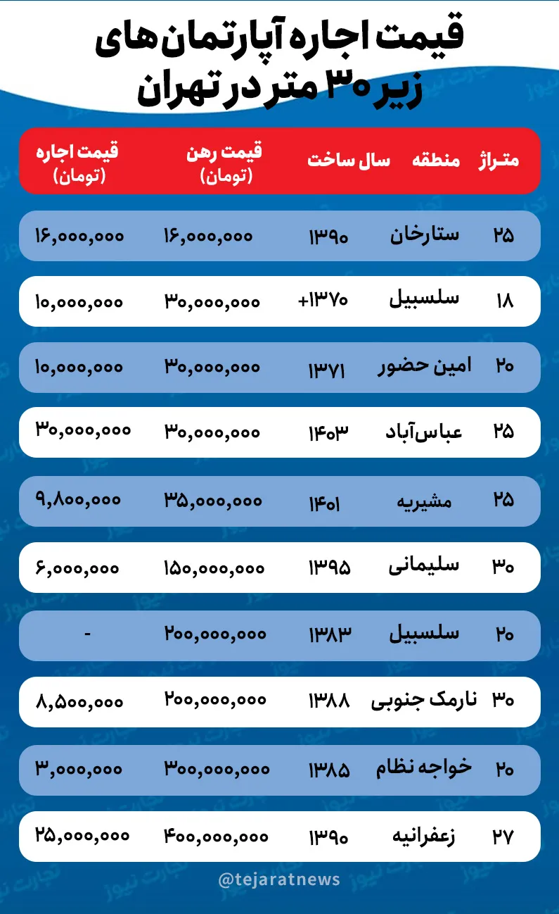 مبالغ اجاره خانههای زیر ۳۰ متر در تهران