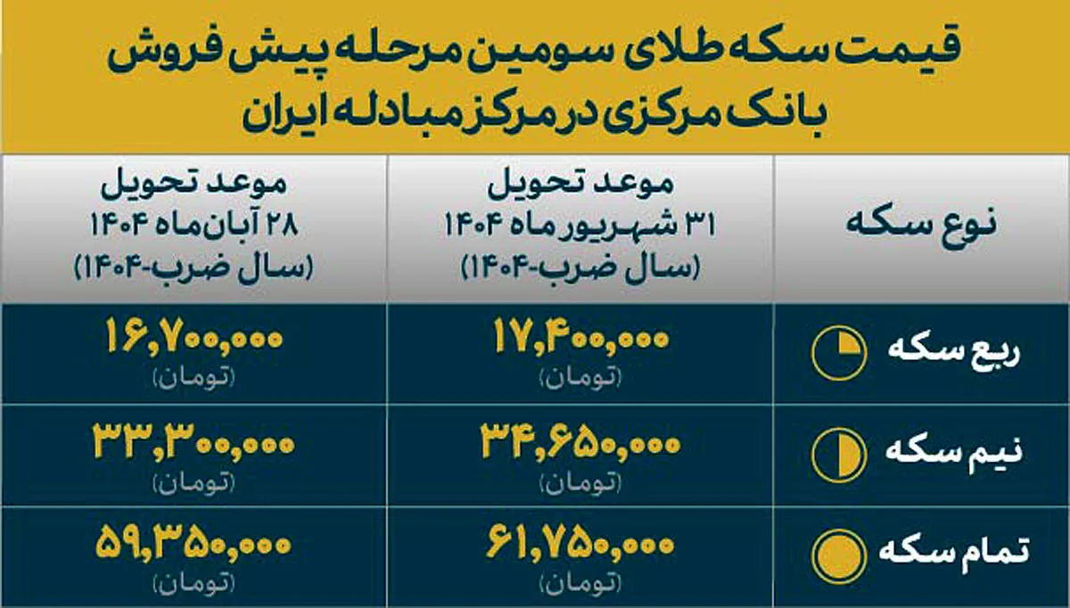 بانک مرکزی قیمت پیشفروش نیمسکه طلا را برای سررسیدهای آبان ماه و شهریور ماه ۱۴۰۴ به ترتیب ۳۳میلیون و ۳۰۰هزار تومان و ۳۴میلیون و ۶۵۰هزار تومان اعلام کرده است؛ نیمسکههای نوبت سوم پیشفروش نیز ضرب ۱۴۰۴ است.