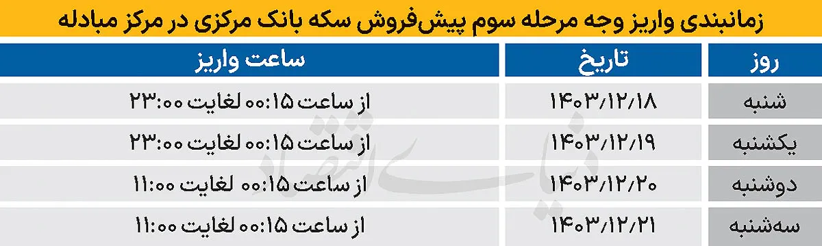 واریز ۱۰۰درصد ارزش سفارش: علاقهمندان به شرکت در مرحله سوم پیش فروش انواع سکه طلای بانک مرکزی، فرصت دارند که روز شنبه مورخ ۱۸اسفندماه الی سهشنبه مورخ ۲۱اسفندماه، معادل ریالی ۱۰۰درصد ارزش سفارش پیشخرید به انضمام کارمزد معامله را از طریق درگاه پرداخت اینترنتی در کیف پول الکترونیکی خود تامین کند. متقاضی باید در بازه زمانی اعلامی واریز وجه، ارزش سفارش و کارمزد پیش خرید را واریز کنند؛ کارمزد پیش خرید معادل یک در هزار (۰,۱ درصد) ارزش سفارش است.