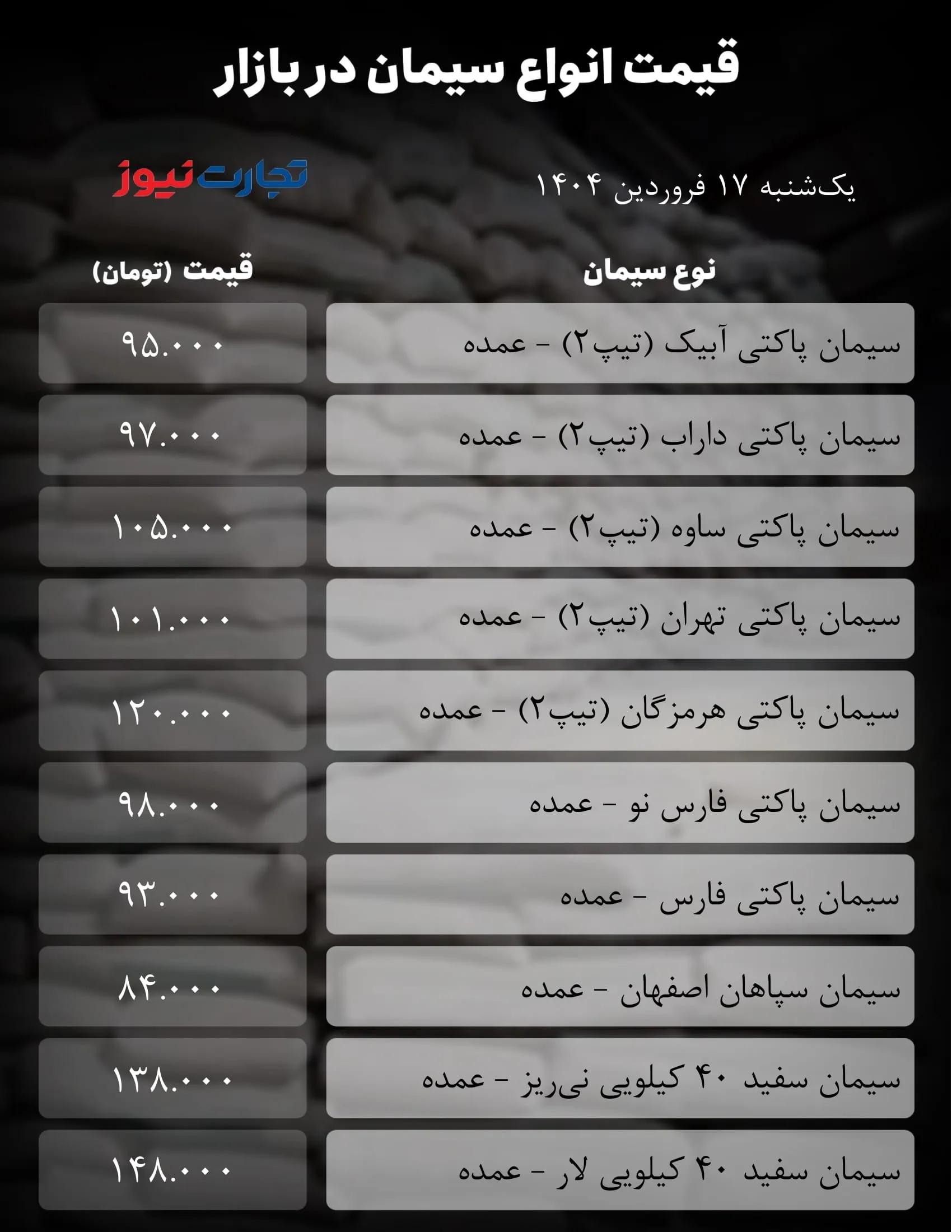 قیمت سیمان امروز 17 فروردین 1404 + جدول
