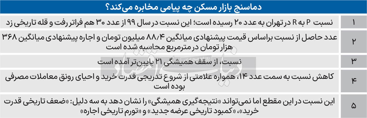 با این حال، معنا و مفهوم سطح فعلی دماسنج مسکن مشخص میکند، نتیجهای که طی دورههای قبل، از «بازگشت نسبت قیمت به اجاره به سطوح پایین» در بازار خرید و فروش آپارتمان بهوجود میآمد، در مقطع فعلی به سه دلیل قابل تحقق نیست. کاهش P به R در اواخر دهه۸۰ و همچنین اواسط دهه۹۰ بهدلیل آنکه علامتی مشخص از فرود قیمت آپارتمان به سطح متعارف بود، باعث «پایان رکود معاملاتی» و «شروع تدریجی رونق خرید مصرفی مسکن» شد. اما در این دوره، این کاهش عمدتا ناشی از «رشد تاریخی اجارهبها» بوده است. ضمن آنکه، دو فاکتور دیگر مانع احیای رونق خرید است.