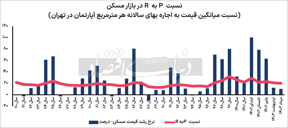 طی دو سال گذشته، اجارهبها یعنی R با «رشد تاریخی» همراه شد. تورم اجاره در بازار مسکن تهران طی سالهای اخیر به دو برابر سطح تاریخی خود رسید بهطوری که در سالهای 99 تا 1402 اجارهبها در تهران به ترتیب 40 درصد، 45 درصد، 44درصد و 52درصد جهش کرد. رشد شدید اجارهبها بهویژه در ماههای اخیر عاملی شد برای اینکه عدد حاصل از نسبت P به R افت کند. به ویژه در حال حاضر که تورم مسکن به 10درصد کاهش یافته اما هنوز تورم اجاره در سطح 40درصد قرار دارد، نسبت P به R با شیب بیشتری افت کرده و بهخاطر همین در مقایسه با ابتدای سال 1402، حدود 10 واحد عددی کاهش یافته است.