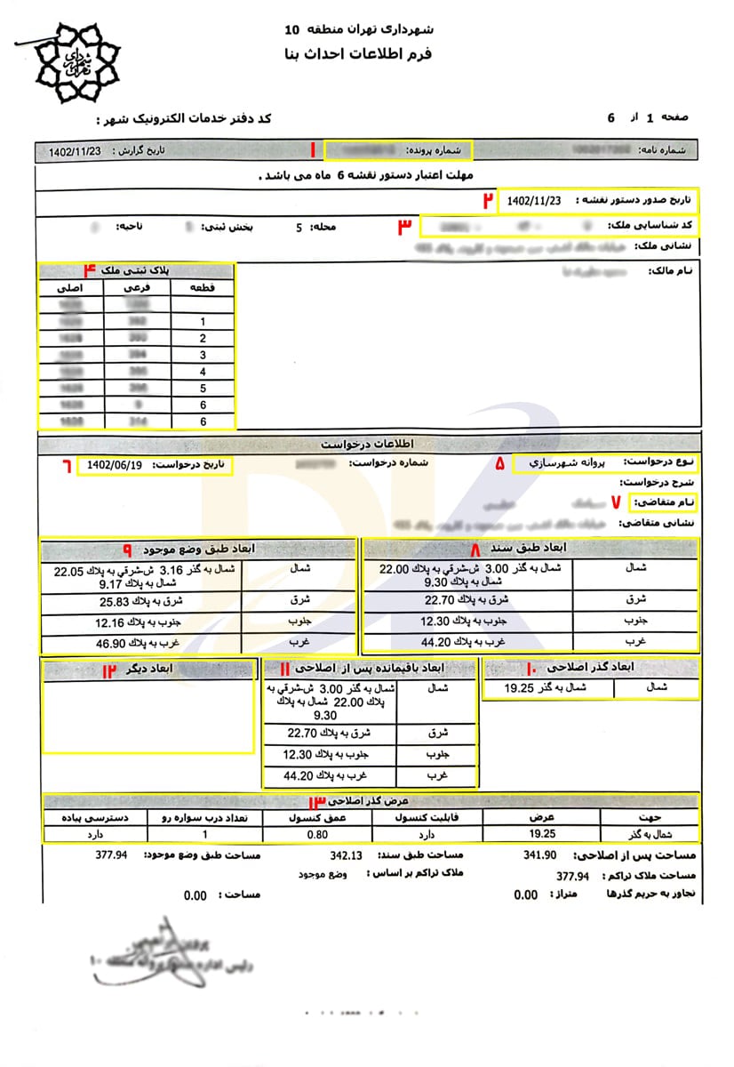 کد ارتفاعی ملک: مشخصات مربوط به سطح مبنا (Benchmark) و ارتفاع مجاز ساخت برای سازگاری با منطقه بندی شهری.