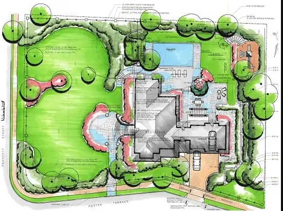 نقشه فضای سبز و محوطه سازی: شامل موقعیت و ابعاد باغها، مسیرهای پیاده روی، فضاهای نشیمن و سایر عناصر طراحی محوطه.