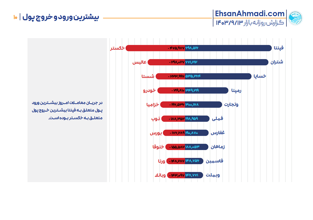 در جریان معاملات امروز بیشترین ورود پول متعلق به فپنتا بیشترین خروج پول متعلق به خگستر بوده است.