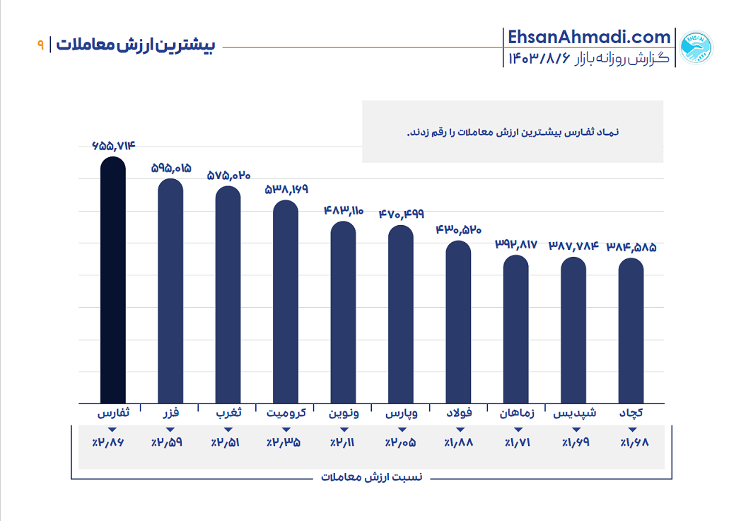 در جریان معاملات امروز بیشترین ورود پول متعلق به فولاد و بیشترین خروج پول متعلق به ثفارس بوده است.