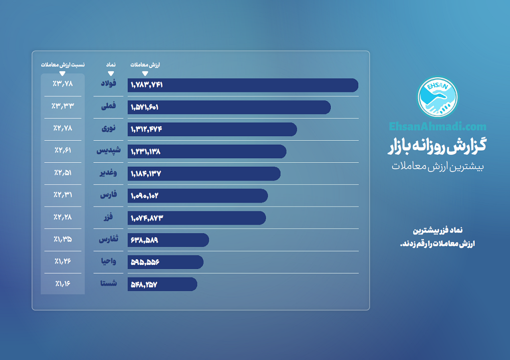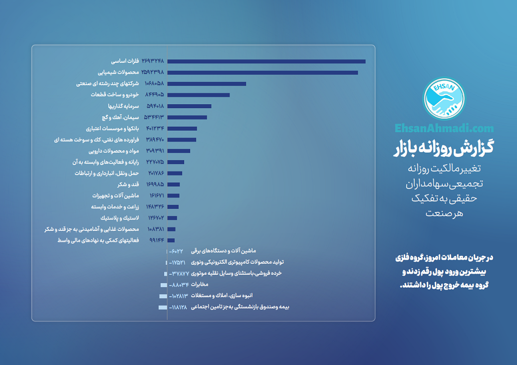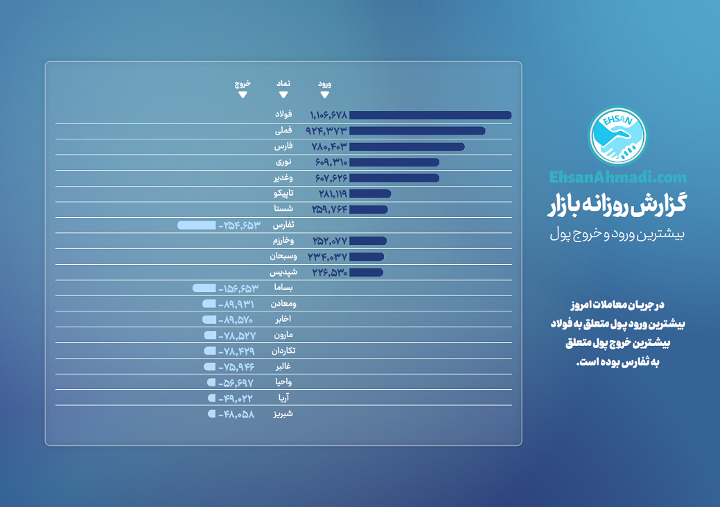 در جریان معاملات امروز بیشترین ورود پول متعلق به فولاد بیشترین خروج پول متعلق به ثفارس بوده است.