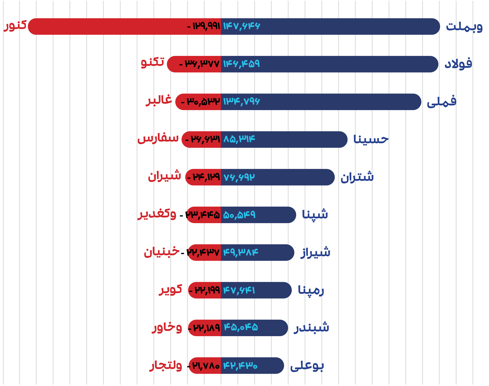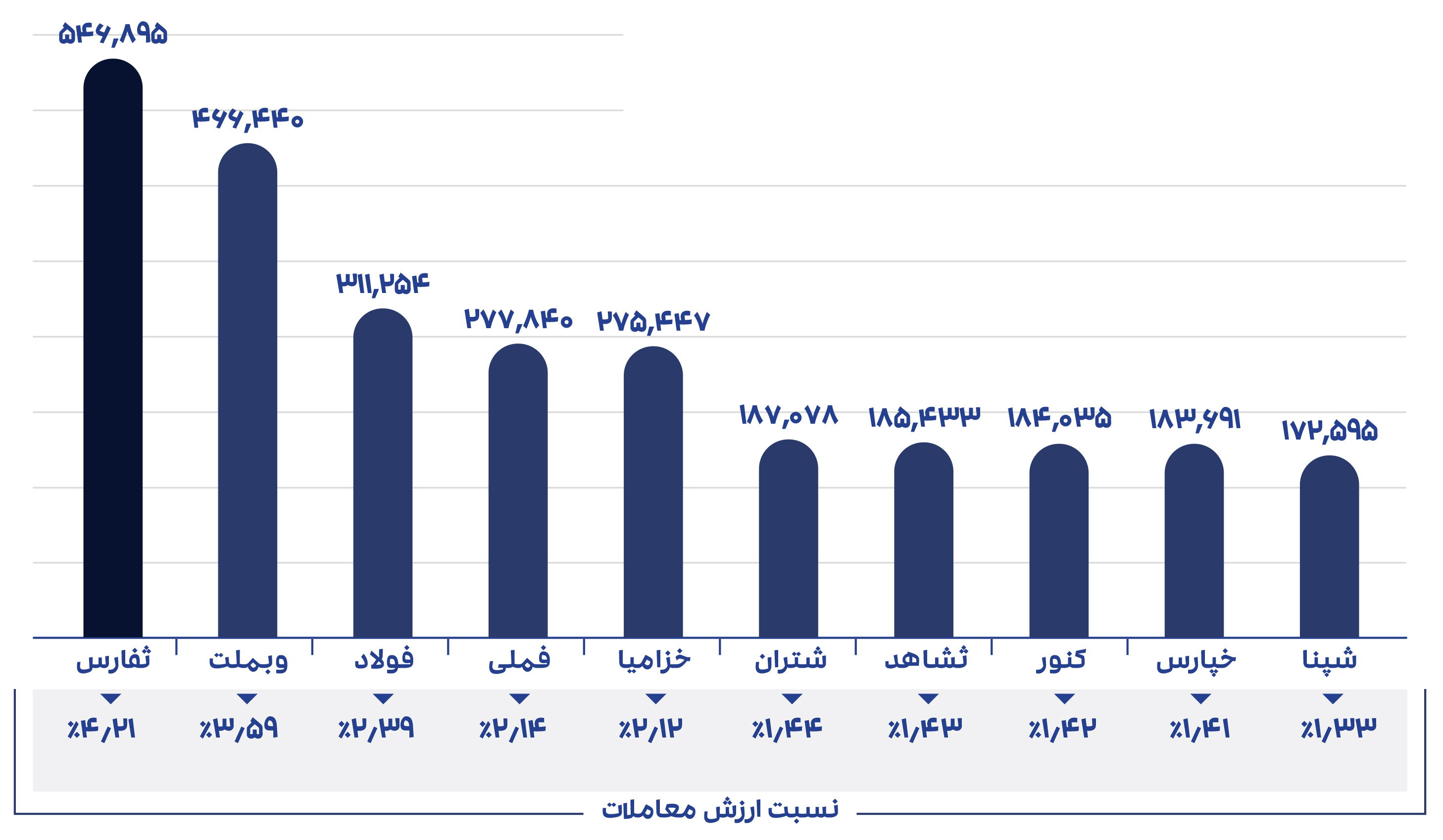 بیشترین ارزش معاملات: نماد ثفارس با حدود 4.21% و بملت 3.59% بیشترین ارزش معاملات را رقم زدند.