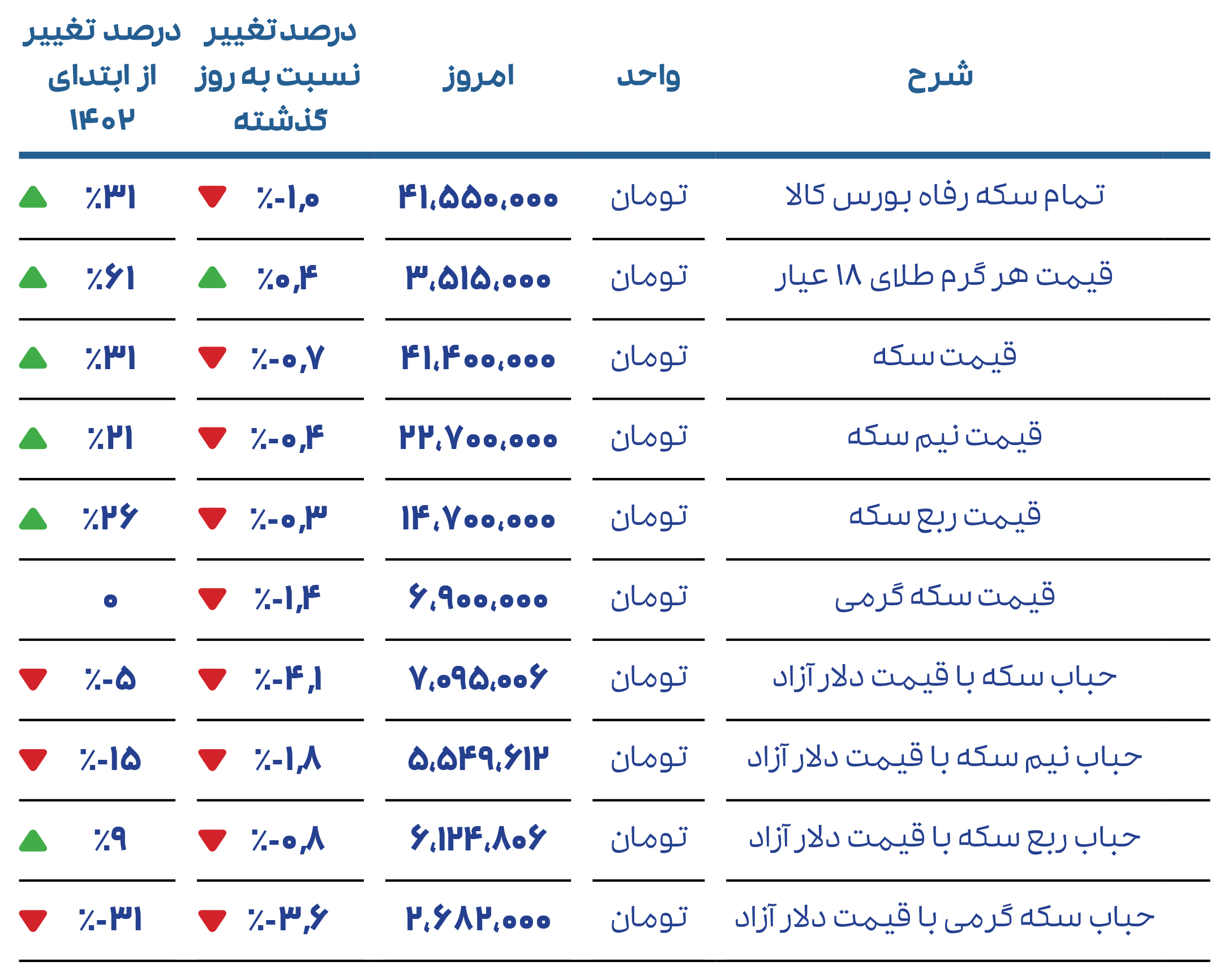 خلاصه ارقام طلا و سکه: تمام سکه رفاه با 0.1% کاهش و قیمت سکه با 0.7% کاهش همراه بود.