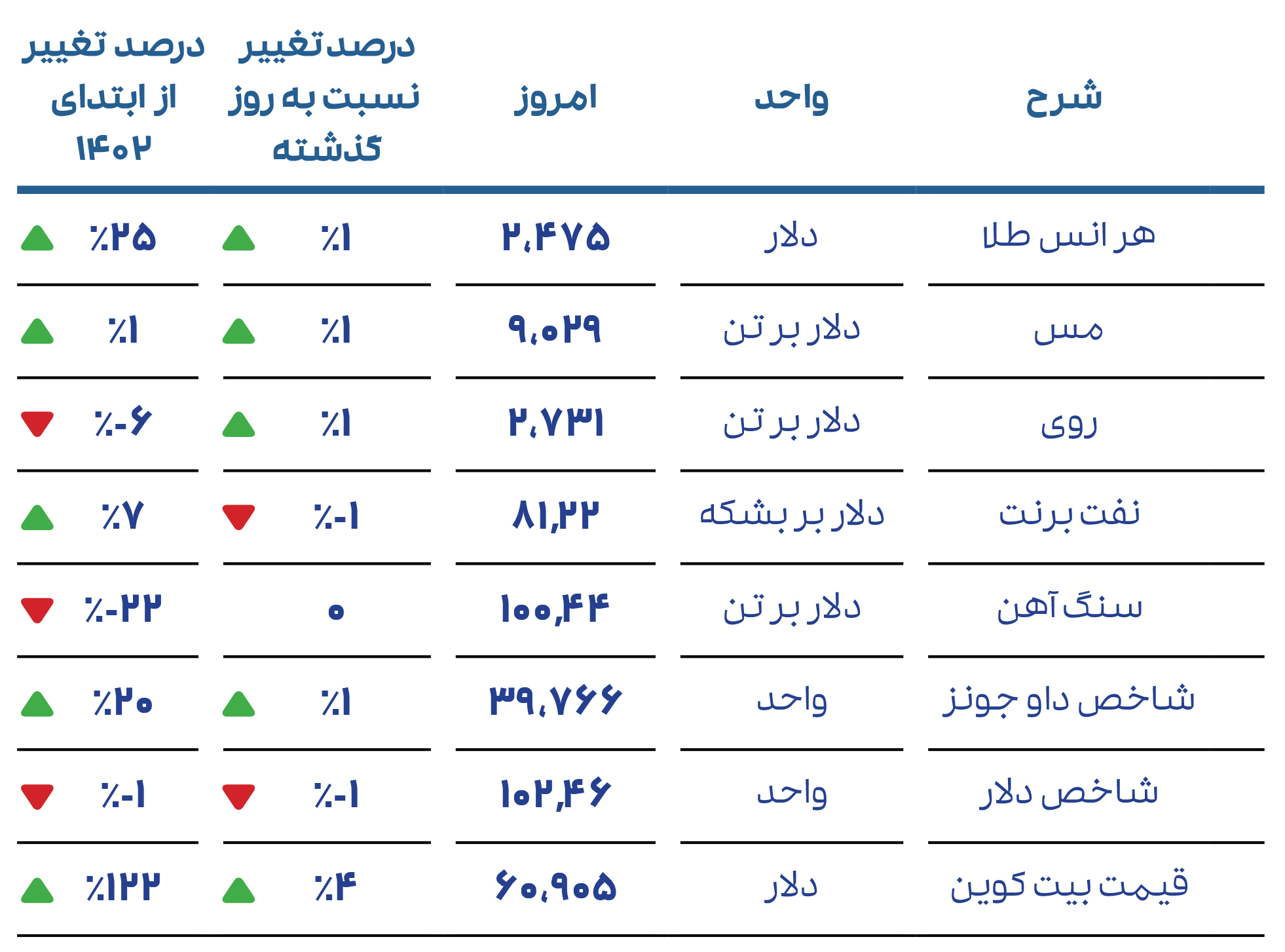 خلاصه ارقام کامودیتی: در خصوص ارقام جهانی طلا با 1% رشد و بیت کوین نیز با 4% افزایش همراه بوده است.