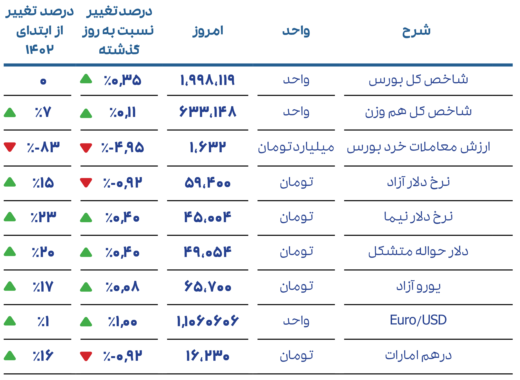 خلاصه ارقام بورس و ارز: شاخص کل بورس اوراق بهادار تهران، امروز 0.35% بیشتر از آخرین روز معاملاتی قبل، در سطح 1.998.653 واحد به کار خود پایان داد. خالص تغییر مالکیت سهامداران حقیقی، مثبت و در حدود 45 میلیارد تومان ثبت شد.