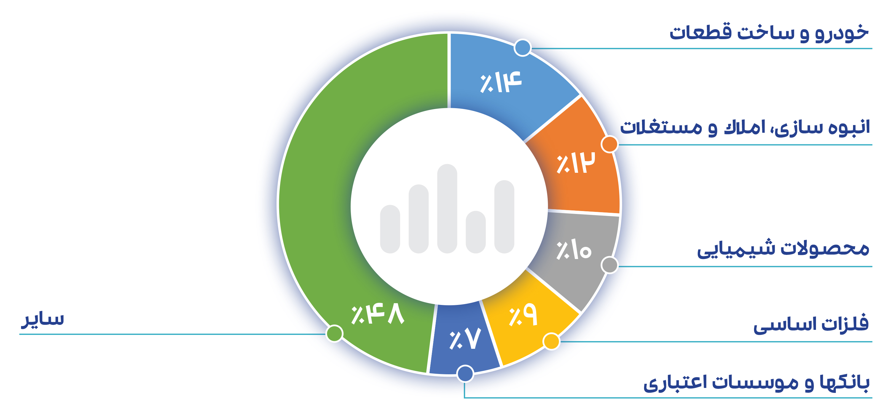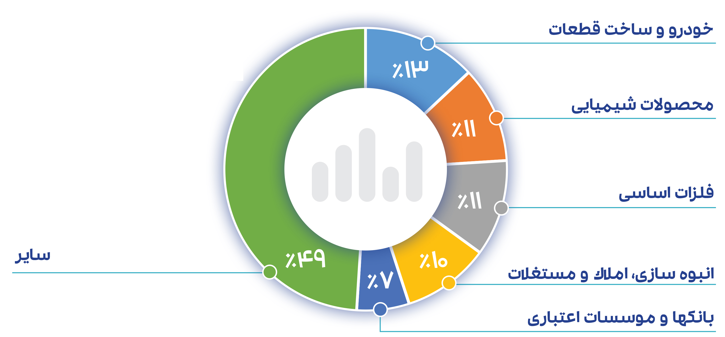 سهم صنایع از کل ارزش معاملات روز بازار: بیشترین سهم از ارزش معاملات امروز متعلق به سایر گروه ها با 49% سهم از کل ارزش معاملات روز، گروه خودرو و شیمیایی به ترتیب 13% و 11% سهم از کل ارزش معاملات روز بازار را رقم زدند.