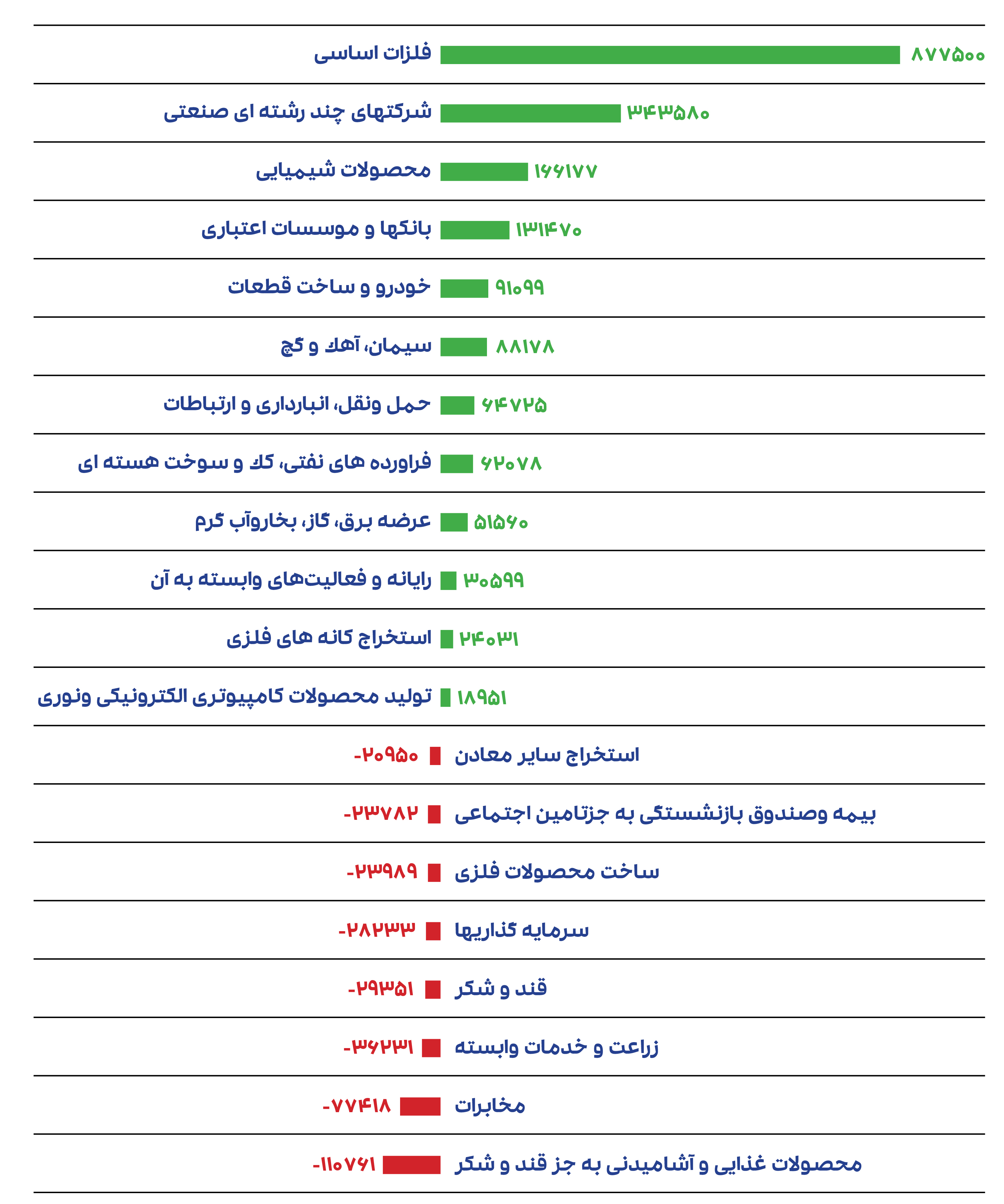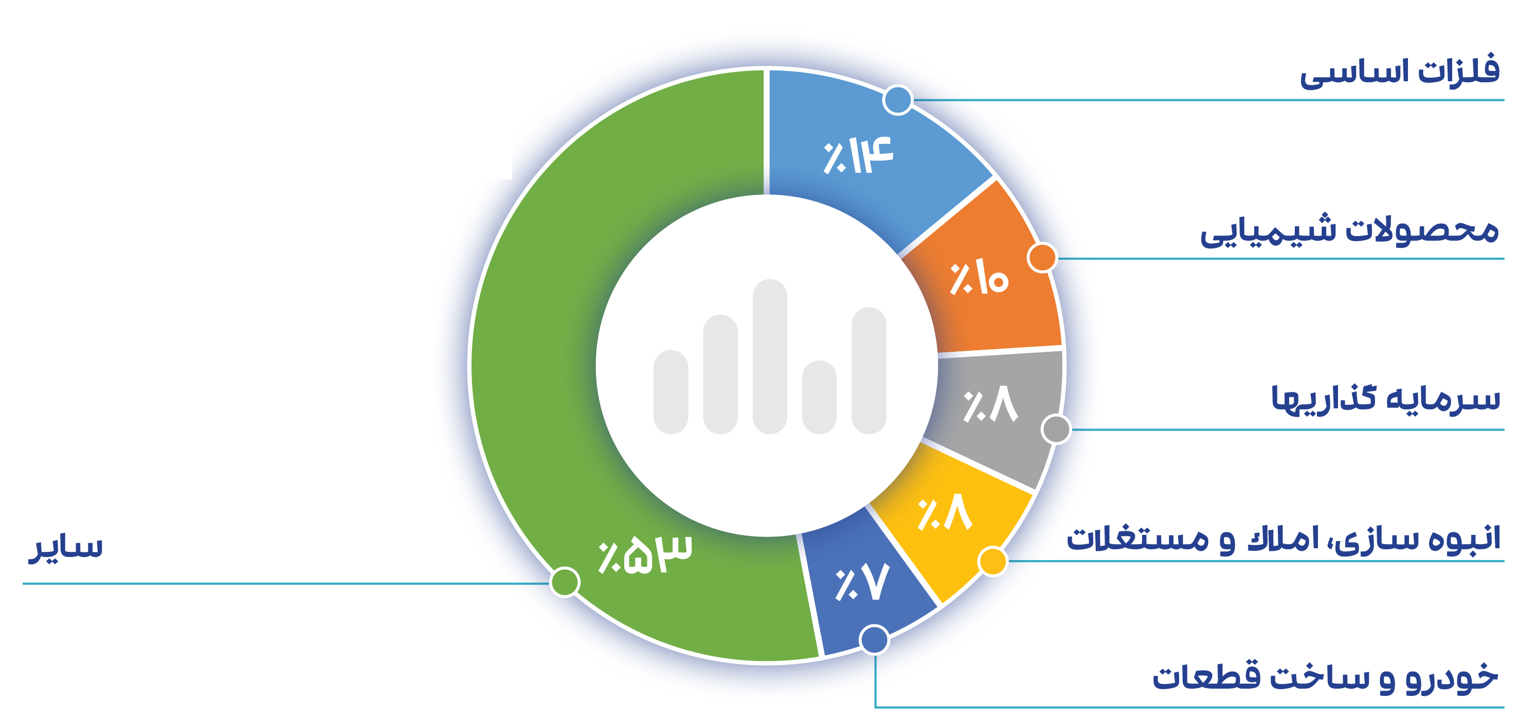 سهم صنایع از کل ارزش معاملات روز بازار: بیشترین سهم از ارزش معاملات امروز متعلق به سایر گروه ها با 53% سهم از کل ارزش معاملات روز، گروه فلزات و شیمیایی به ترتیب 14% و 10% سهم از کل ارزش معاملات روز بازار را رقم زدند.