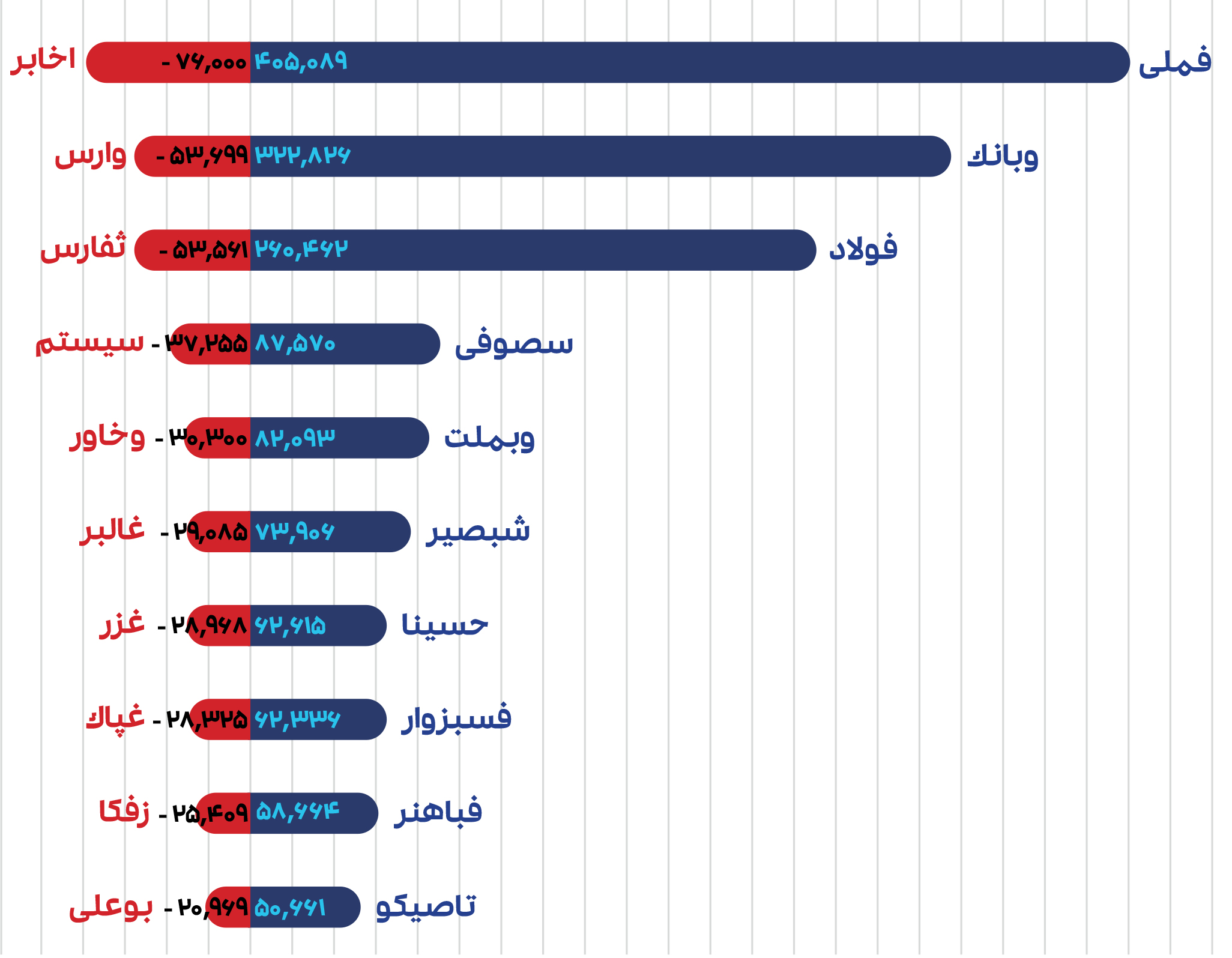 بیشترین ورود و خروج پول: در جریان معاملات امروز بیشترین ورود پول متعلق به فملی و بیشترین خروج پول متعلق به اخابر بوده است.