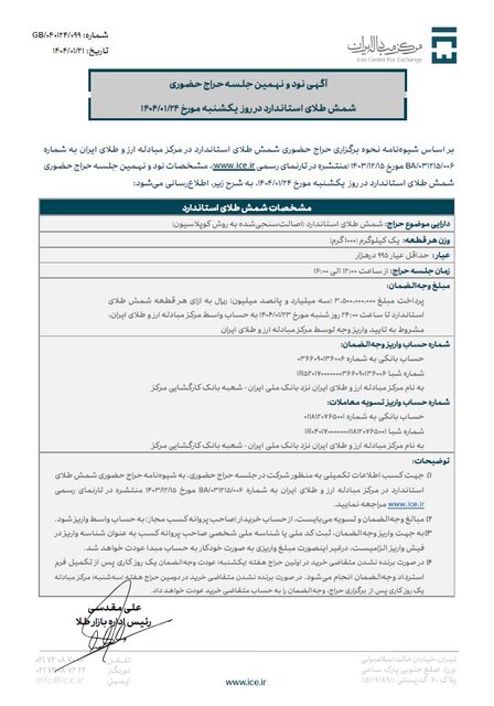 به گزارش اخبارساخته ها؛ طبق اعلام مرکز مبادله و بر اساس شیوه نامه نحوه برگزاری حراج حضوری شمش طلای استاندارد در مرکز مبادله ارز و طلای ایران، نود و نهمین جلسه حراج شمش طلای استاندارد در روز یکشنبه مورخ ۲۴ فروردین ماه ۱۴۰۴ برگزار میشود و مهلت واریز وجه الضمان تا ساعت ۲۴ روز شنبه ۲۳ فروردین ماه فراهم است.