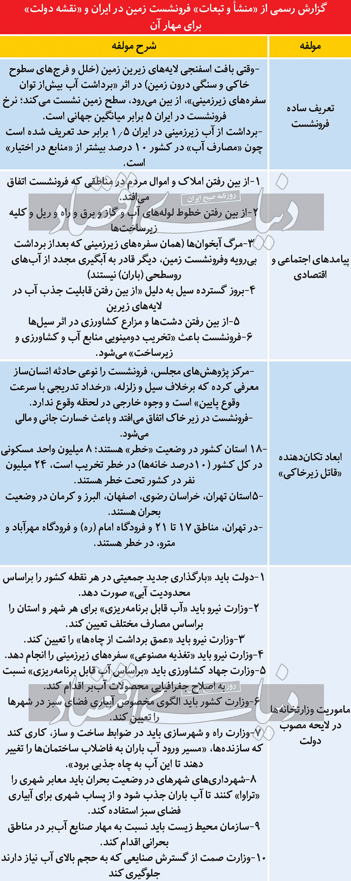 برای شهرداریهای کشور نیز تکلیف شده است که در وضعیت بحران باید معابر شهری را «تراوا» کنند تا آب باران جذب شود و از پساب شهری برای آبیاری فضای سبز استفاده کنند. سازمان محیطزیست هم باید نسبت به مهار صنایع آببر در مناطق بحرانی اقدام کند. اما این وزارتخانهها و سازمانها نظرات متفاوتی درباره این لایحه دارند. از آن جمله وزارت کشور معتقد است که به دلیل تعدد قوانین در این زمینه نباید به سمت ایجاد قانون جدید رفت. وزارت نیرو معتقد است فرونشست در کشور متولی ندارد اما این لایحه هم تکلیف قانونی جدیدی ایجاد نمیکند. از دید وزارت جهاد کشاورزی، در صورتی که پیشتر قانون توزیع عادلانه آب و قانون افزایش بهرهوری آب به درستی انجام شده بود فرونشست هماکنون کنترل شده بود. در این گزارش، با اشاره به اینکه فرونشست در دو نوع «طبیعی» و با منشأ «انسانی» ایجاد میشود، بخش قابلتوجهی از بحران فرونشست در کشور با منشأ انسانی یا نوعی حادثه انسانساز معرفی شده که برخلاف سیل و زلزله، «رخداد تدریجی با سرعت وقوع پایین» است و وجوه خارجی در لحظه وقوع ندارد. در واقع، فرونشست پدیدهای است که به تدریج رخ میدهد و همین تدریجی بودن آن باعث شده است این بحران کمتر دیده شده و مورد توجه قرار بگیرد. وقتی بافت اسفنجی لایههای زیرین زمین (خلل و فرجهای سطوح خاکی و سنگی درون زمین) در اثر «برداشت آب بیشاز توان سفرههای زیرزمینی»، از بین میرود، سطح زمین نشست میکند. فرونشست در زیر خاک اتفاق میافتد و باعث خسارتهای جانی و مالی میشود. بر اساس تحقیقات به عمل آمده هماکنون 18 استان کشور در وضعیت «خطر» ناشی از بحران فرونشست هستند؛ 8 میلیون واحد مسکونی در کل کشور (10درصد خانهها) در خطر تخریب است و 24 میلیون نفر نیز در معرض خطرات ناشی از این پدیده هستند. در این میان، 5 استان تهران، خراسان رضوی، اصفهان، البرز و کرمان در وضعیت بحران بالا هستند. از آن جمله در تهران، مناطق 17 تا 21 و فرودگاه امام خمینی (ره)، فرودگاه مهرآباد و خطوط انتقال انرژی در بخش جنوب غرب و خطوط قطار شهری و مترو، در خطر هستند. در اصفهان نیز حدود 10هزار کیلومترمربع شامل 30هزار و300 واحد مسکونی، به طور ویژه پالایشگاه برق شهید منتظری، ورزشگاه نقش جهان، فرودگاه بینالمللی شهید بهشتی، پستهای خطوط انتقال نیرو فشار قوی، شهرک صنعتی محمودآباد، خطوط انتقال سوخت به فرودگاه نایین و سگزی، خطوط قطار برونشهری بهویژه خط اصفهان به شاهین شهر، ابنیه تاریخی مانند پل روی رودخانه زاینده رود به شدت در معرض تهدیدهای ناشی از فرونشست هستند.