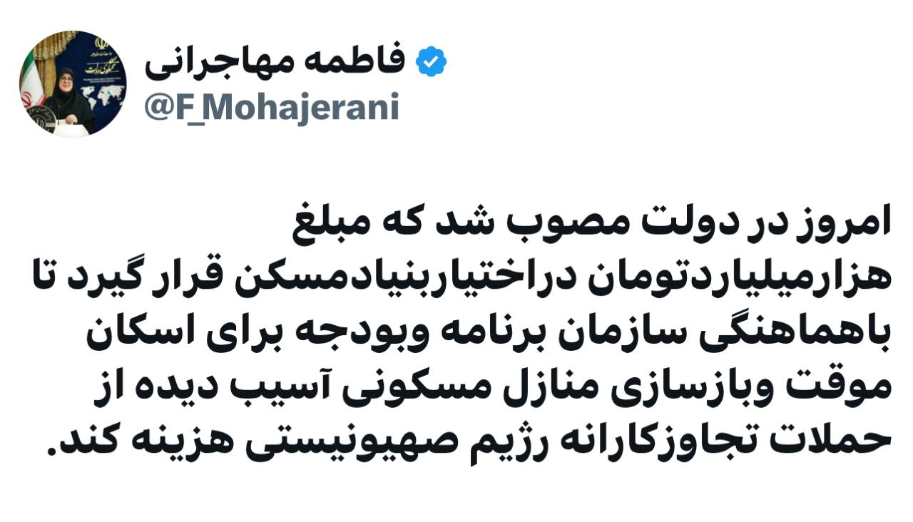 «امروز در دولت مصوب شد که مبلغ هزار میلیارد تومان در اختیار بنیاد مسکن قرار گیرد تا باهماهنگی سازمان برنامه و بودجه برای اسکان موقت و بازسازی منازل مسکونی آسیبدیده از حملات تجاوزکارانه رژیم صهیونیستی هزینه کند.»