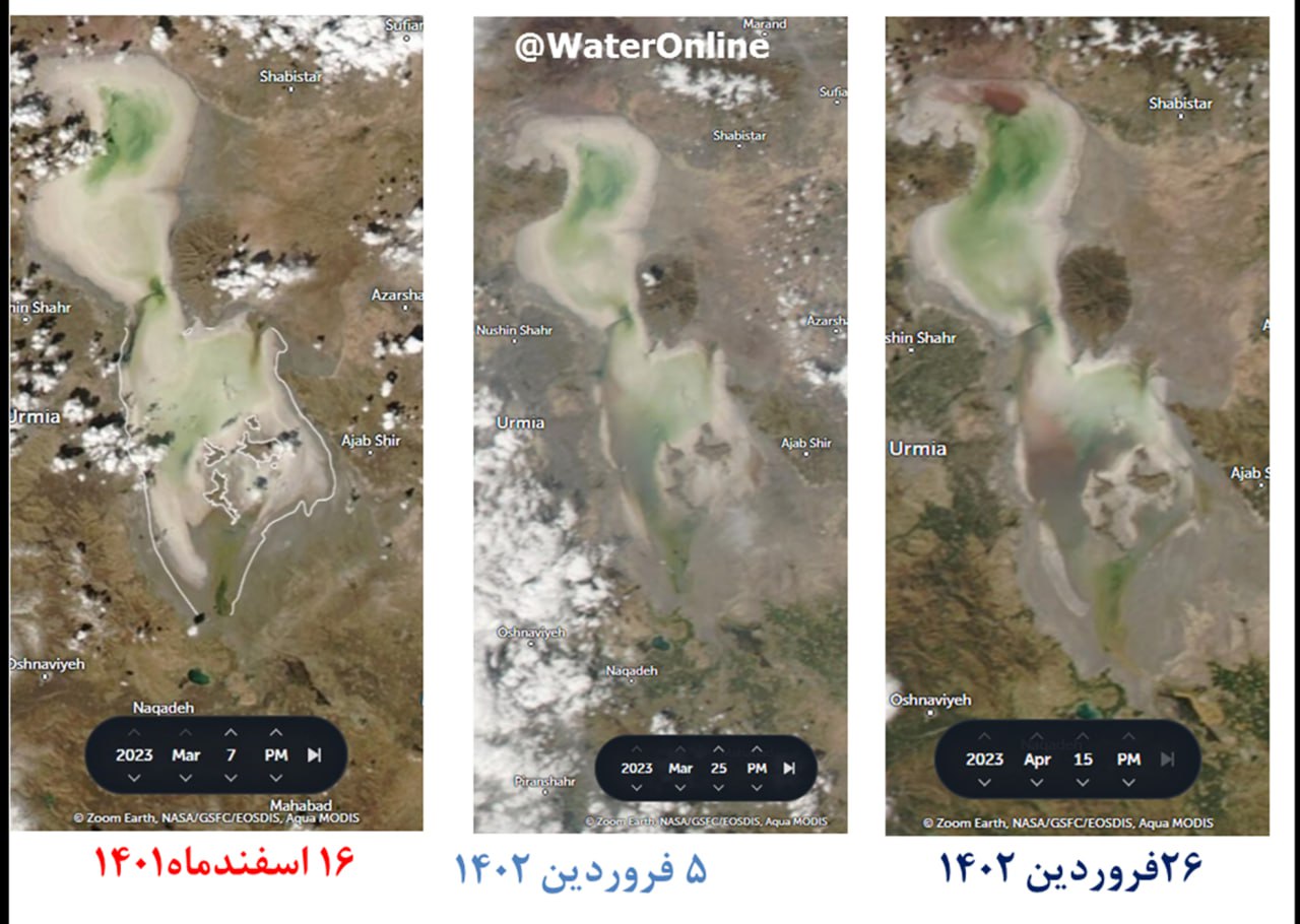 تصاویر ماهواره ای حد فاصل بین 16 اسفند ماه 1401 تا 26 فروردین ماه 1402 نشان از بهبود نسبی وضعیت دریاچه ارومیه در طی این بازه زمانی دارد.