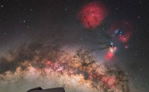 سمت راست عکس، ابرهای رنگی Rho Ophiuchi دیده میشن و نزدیک بالای وسط عکس هم سحابی قرمز و گرد Zeta Ophiuchi هست. این عکس اواخر فوریه از Maunakea در هاوایی آمریکا گرفته شده و تلسکوپی که توی پیشزمینه میبینی، تلسکوپ ۲.۲ متری دانشگاه هاواییه.