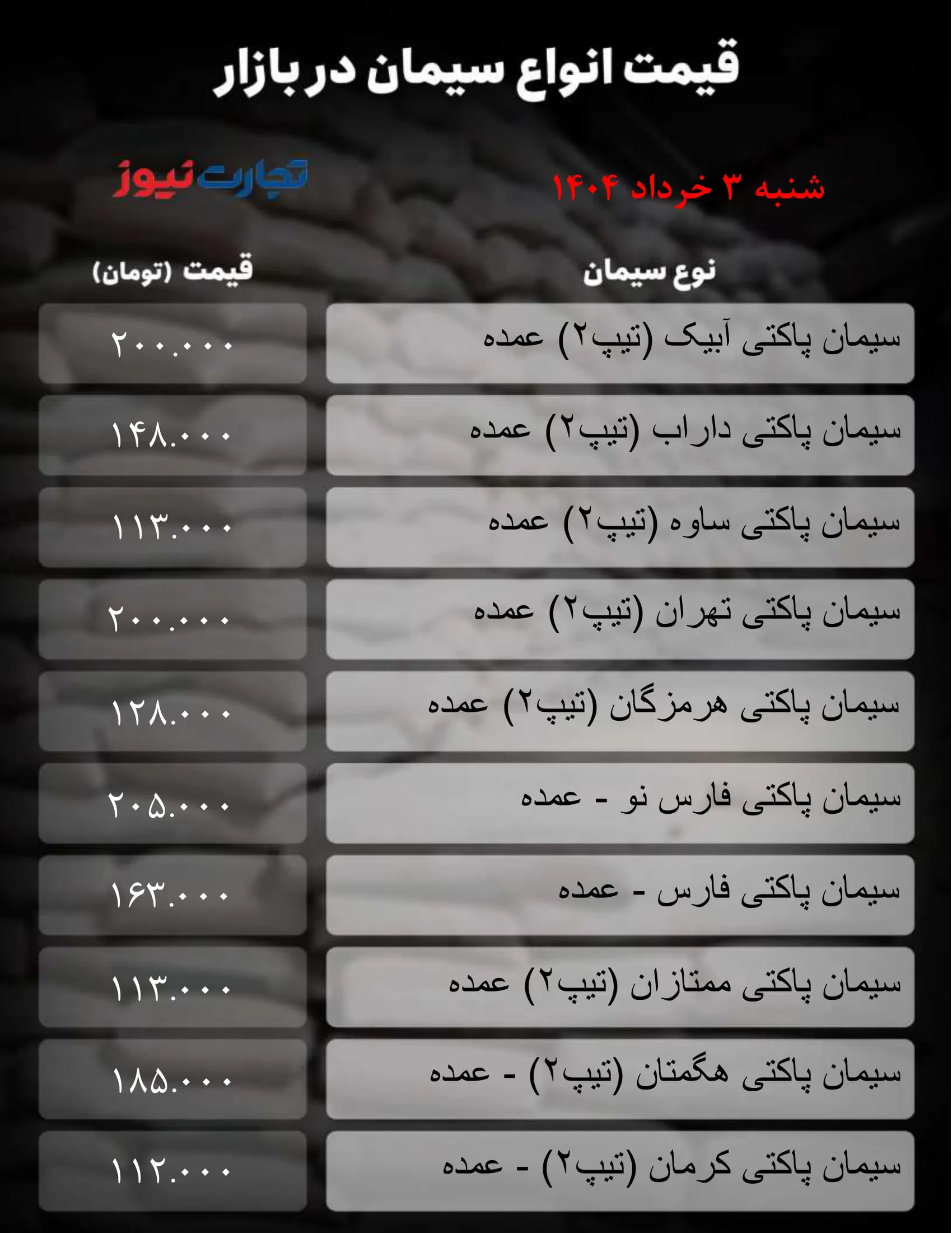 قیمت سیمان امروز ۳ خرداد ۱۴۰۴ + جدول